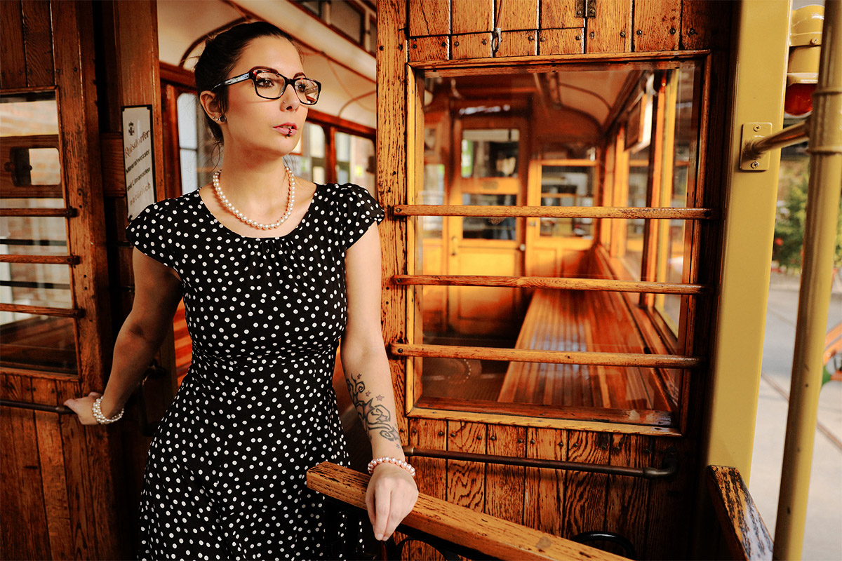 Das Straßenbahnmuseum Thielenbruch versammelt 125 Jahre Straßenbahngeschichte unter einem Dach. Angefangen bei ersten elektrischen Triebwagen, Baujahr 1902, über die runden Bahnen, die in den 20er, 30er und 40er Jahren das Straßenbild prägten, bis hin zu den kantigen Baureihen der 70er Jahre finden sich alle Epochen an Schienenfahrzeugen, die bei diesem Workshop als wohl einmalige Kulisse dienen. Vor und in den Triebwagen der jeweiligen Epoche werden unseren beiden – im Stil der jeweiligen Zeit -eingekleideten Modelle  inszeniert. Vom Partygirl der wilden 20er über eine düstere “Film Noir- Szene”  bis hin zum flippigen Vamp der 70ger – mit mobilem Blitzlicht, lichtstarken Festbrennweiten, Nebelmaschine und der fantastischen Kulisse des Straßenbahnmuseums werden so einmalige Bilderwelten geschaffen._E3R6230_web2